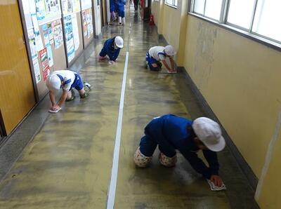 力を込めて床を拭いて(磨いて)います。ステキです。