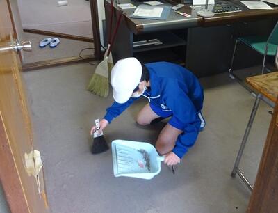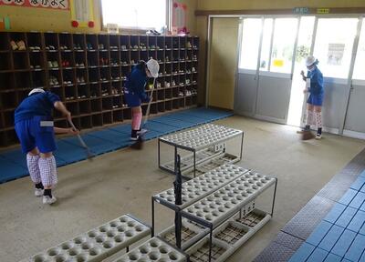 昇降口をほうきですみずみまで掃いています。ステキです。
