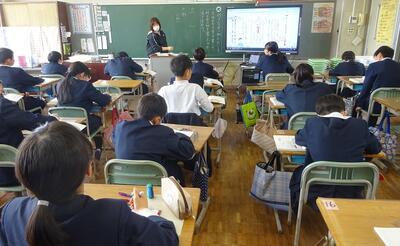 6年1組は、国語で好きな食べ物について表現していました。落ち着いた学習ぶりがステキです。
