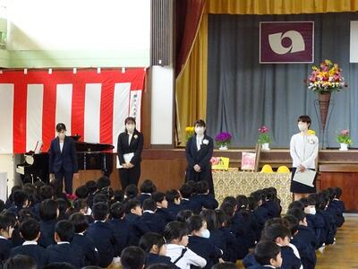 令和6年度の着任式・始業式が体育館で行われました。まず、着任式が行われ13名の先生が紹介されました。下の写真は、6年生による歓迎の言葉です。本校のよさは「あいさつ」と「無言清掃」と堂々と話すことができました。