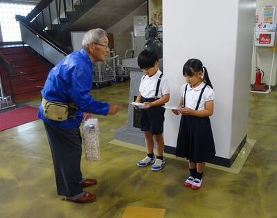 支部長様から1年生の代表2人にティッシュが手渡されました。