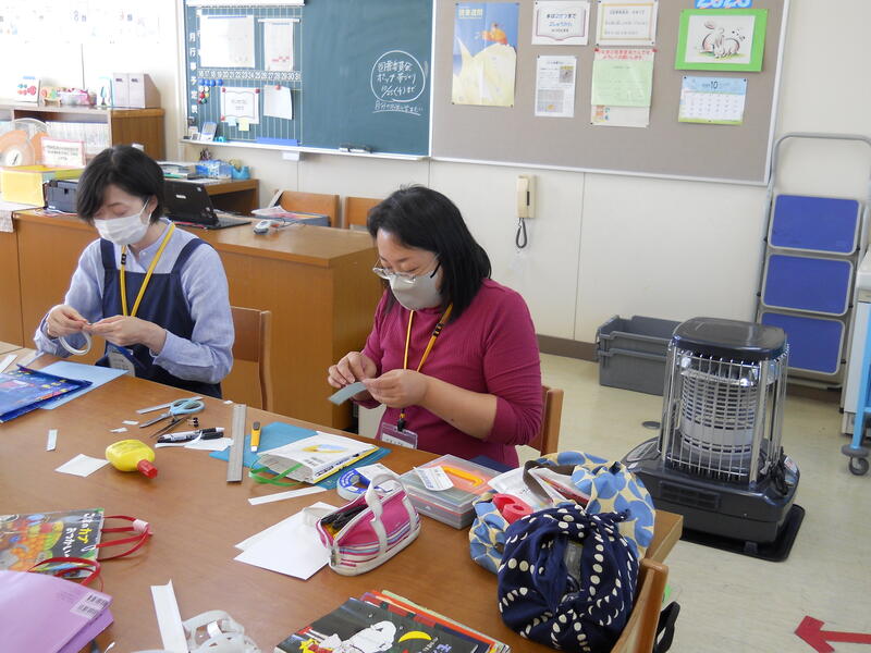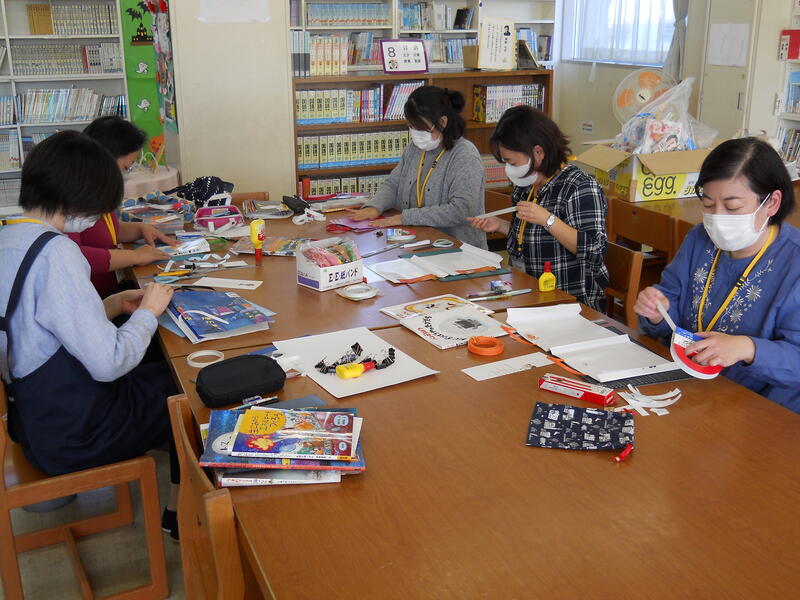 続いて小川小学校での研修の様子です。研修テーマは「実践で使えることをみんなで教え合う」です。子どもたちに本に関心をもってもらうためのポップ作りなどを行いました。