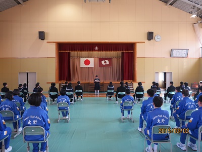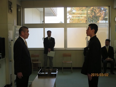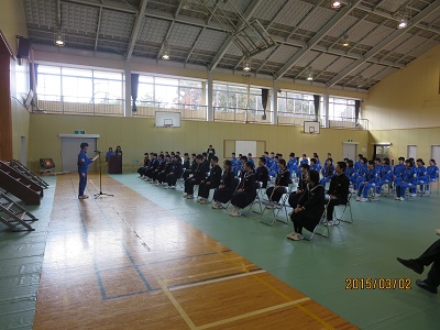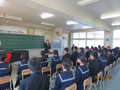 放課後の時間に、大野中学校同窓会長の草野啓明先生に来校していただき、3年生(卒業生)が平成26年度同窓会入会式を行いました。