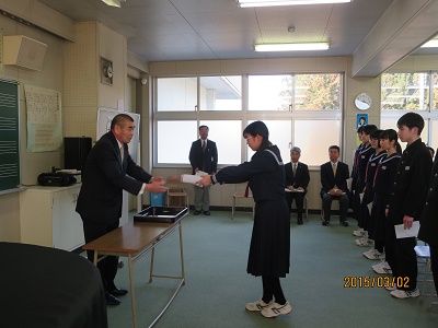 同窓会長さんからの挨拶の後、卒業生への記念品授与があり、卒業生の代表者が同窓会入会生誓いのことばの宣誓をしました。