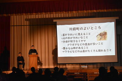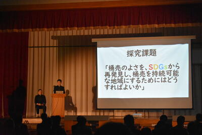 今までの総合的な学習の時間での学びをもとに、閉校、人口減少、高齢化などの数々の課題がある桶売を持続可能な地域にするためにはどうすればよいか、生徒それぞれが考え、発表しました。