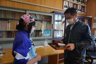 できあがったご飯と味噌汁を校長先生や職員室にいらっしゃった先生方にも食べていただきました。