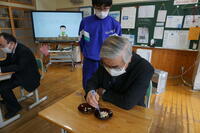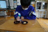 豆つかみゲームは、どちらが早く豆を箸でつかんで移せるかを、チーム対抗で行いました。結果は引き分けでした。