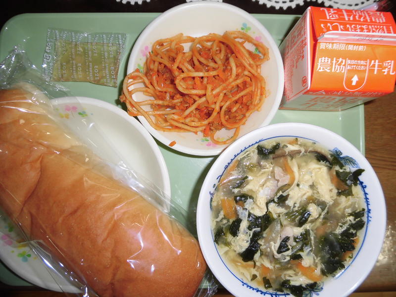 2018年12月6日 13時08分スパゲティミートソース たまごスープ コッペパン 福島県産リンゴジャム 牛乳
