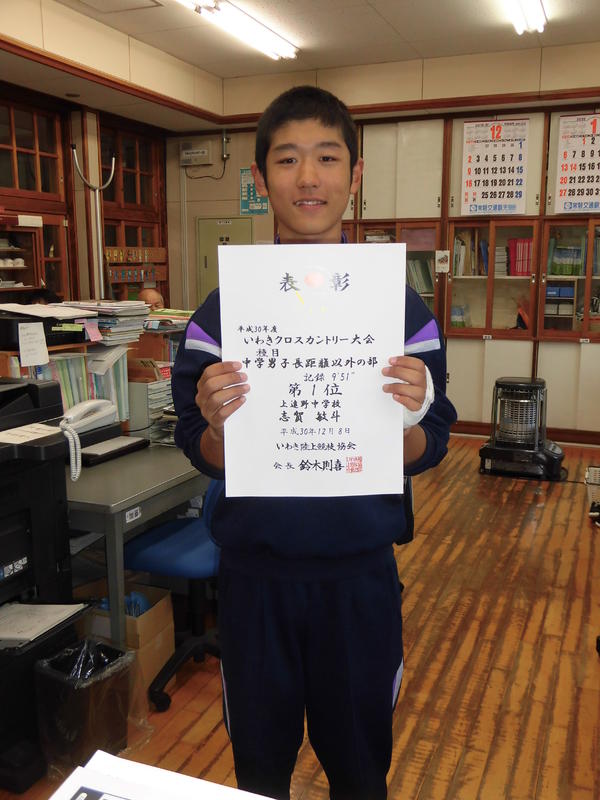12月8日(土)21世紀の森公園で、いわきクロスカントリー大会が行われ、本校2年生の志賀 敏斗 くんが、中学男子長距離以外の部(3km)に出場し、見事1位になりました。おめでとうございました。敏斗くんは中長距離が得意で、中学1年生のときには1年1、500mで県大会に出場しています。今後の活躍が楽しみです。