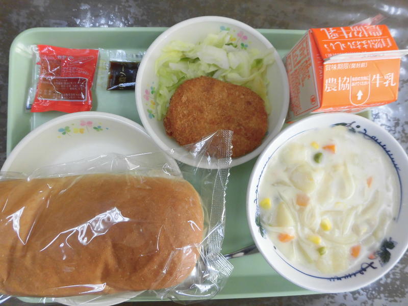 昭和のホワイトシチュー 減量パン イチゴジャム 野菜コロッケ ゆでキャベツ ソース 牛乳