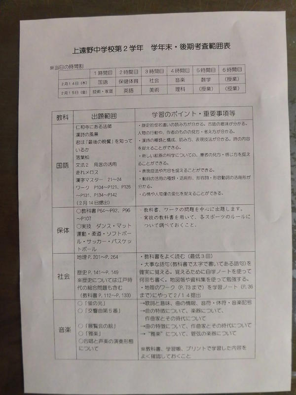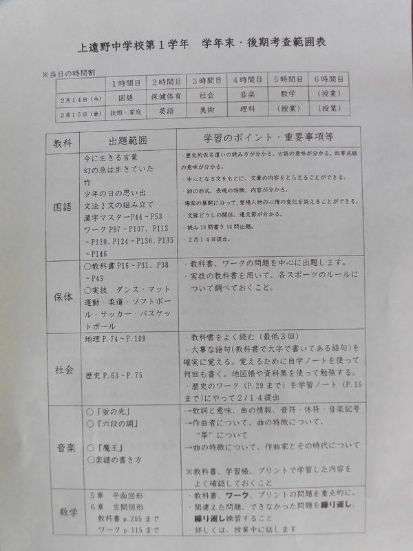 1,2学年の学年末テスト(国、数、英、理、社)、後期テスト(音、美、保体、技・家)は2月14日(木)15日(金)に行われます。