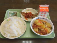 給食メニュー → ごはん お茶ふりかけ 牛乳 ししゃもの甘酢かけ じゃが芋のそぼろ煮