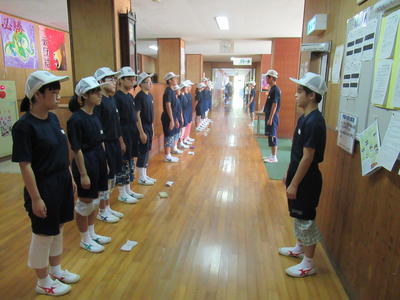 〔1階廊下での整列の様子です。他に誇れる姿です。〕