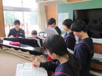 2019年10月8日 08時38分音楽室での練習です。自由曲の「時の旅人」を3つのパートごと練習しています。