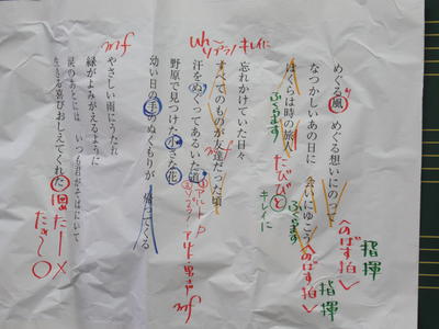 指揮者が細かく指示し、その後全体で合わせています。黒板には、歌うポイントが色マジックで書かれた、拡大された歌詞が掲示されています。