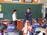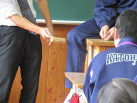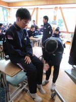 2019年10月16日 11時09分「動物のからだのつくりとはたらき」の単元、「刺激に対するヒトの反応」の授業で、反射のしくみについて、実際に膝下を木づちでたたいて反応を確認する実験を行っていました。