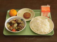 給食メニュー → ごはん 牛乳 とりの野菜のつくね 五目豆 みかん