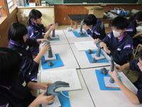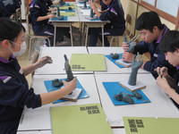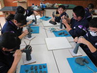 彫塑、各自粘土付けを真剣かつ楽しそうに行っています。時々自分の手をかざして眺めながら修正しています。