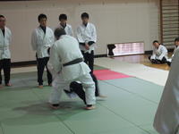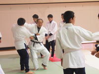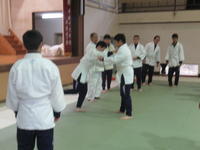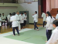 その後、男子が2人組となり、「小内刈り」の練習です。教科担当が、ていねいに組み方・体重移動・投げ方・受け身のとり方等を、モデルの生徒を使って指導しています。