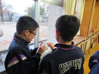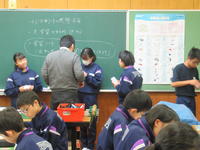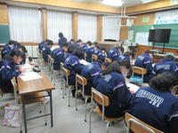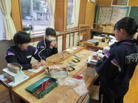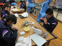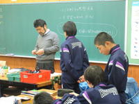 技術の授業です。「エネルギー変換に関する技術」の単元、「手回し発電ラジオを制作しよう」の授業です。はんだ付けで苦労した生徒もいたようですが、完成した生徒は、早速音が出るか試しています。ノートに制作しての感想・反省を書いている生徒もいます。