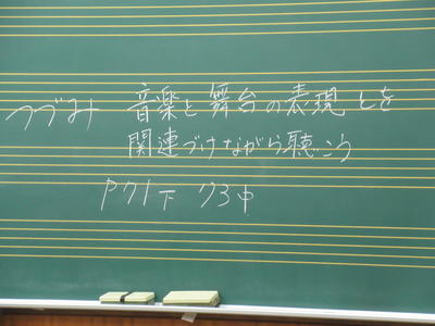 音楽の授業です。「日本の音楽文化を理解しながら鑑賞しよう」の単元で、「能「羽衣」キリから「東遊びの数々に」の部分を鑑賞し、ノートに感想をまとめています。書けた生徒は教科担当の確認を受け、学習ノートまとめをしています。