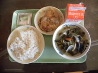 給食メニュー → 麦ごはん 野菜ふりかけ 牛乳 ヒレカツ・卵とじ わかめ汁