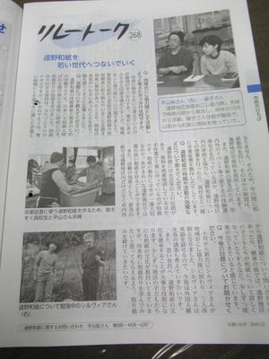 平山夫妻は、市内で開催される様々なイベント等で紙漉きの体験講座を開いたりして、遠野和紙の普及と技術継承に取り組んでいます。たまたま、「広報いわき」(12月号)に平山夫妻の記事が掲載されていましたので、ご家庭でご覧ください。