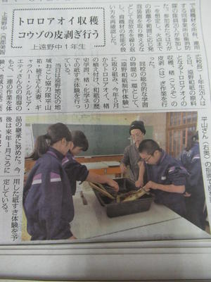 12月7日(土)の「いわき民報」にも、先週の1年生の遠野和紙製作体験学習の様子が掲載されました。