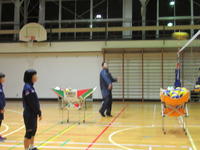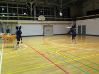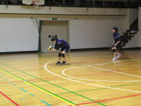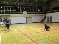 相手コートからのボールをキャッチ→レシーブ練習→6人コートに入り、相手コートからのボールをセッターにあげる練習・・と、段階を追って繰り返し練習しています。