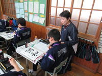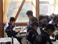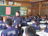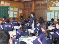教科担当が、ボードに書きながらポイントを指示しています。2つの文字のバランスをとるのが難しいようです。