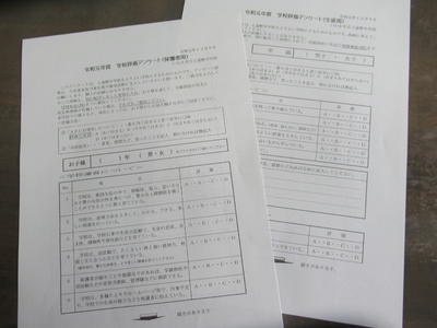 お忙しい中お手数をおかけいたしますが、アンケート用紙にご記入いただき、同時に渡した封筒に入れて、来週の月曜日(16日)まで、学級担任まで提出お願いいたします。