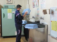 本日で2学期の給食は最後であるため、お盆は洗わず給食センターの回収時に渡します。3年生の日直の生徒が、教室にあるお盆が入っているカゴを、ていねいに洗っています。