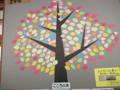 2年生教室前廊下に掲示されている「こころの木」、「2学期を振り返って(反省)」の赤の葉が付け加えられ、一層賑やかになりました。子どもたちの思いが満載の樹木です。