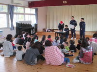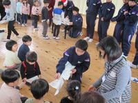 〔紙芝居を披露した後、自分たちが描いたイラストをプレゼント〕