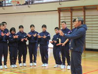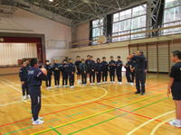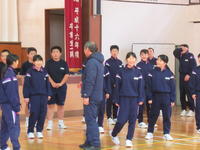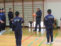 教科担当が、生徒相手にパスの仕方の説明をして、さっそく向かい合っての練習です。担当が気付いたところを取り上げ、ていねいにポイントを説明しています。