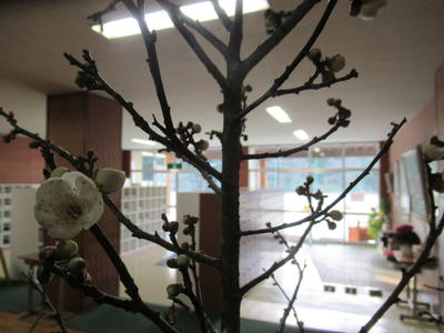 1月10日のHPで紹介いたしました玄関にある梅ですが、写真のように少しずつ花が咲き始めました。