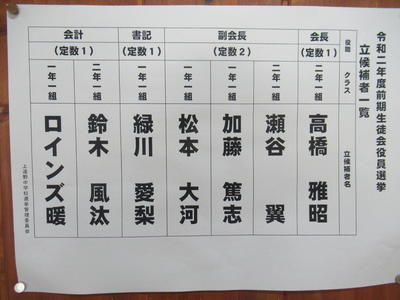 令和2年度前期生徒会役員の立候補が、先週の木曜日(23日)に締め切られ、写真のように1・2年生の7名が立候補しました。今後、2月6日(木)の立会演説会・投票に向けて、”熱き”選挙運動が行われます。