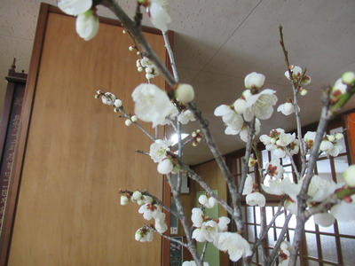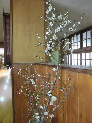 正面玄関にある梅の花がほぼ満開に近い状態となり、綺麗な白い花を咲かせています。