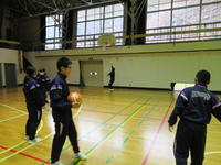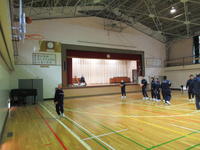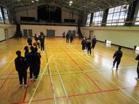 2020年1月28日 12時01分バスケットボールです。4つの班に分かれて、ドリブルしながらシュートする練習をしています。うまくシュートできたときに、自然と周りから「ナイス シュート!」と声があがるのがいいですね。