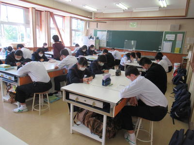2020年10月2日 10時04分「盆土産」のまとめのプリントに取り組んでいます。時間を指定して実施し、その後解説を行いました。