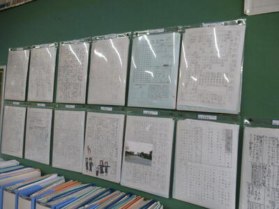 教室背面に、進路学習の一環として取り組んだ、生徒各自の「高校新聞」が掲示されています。