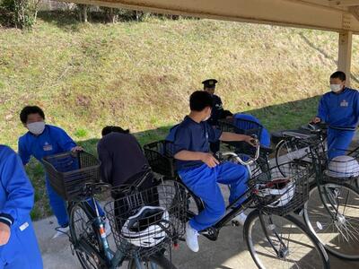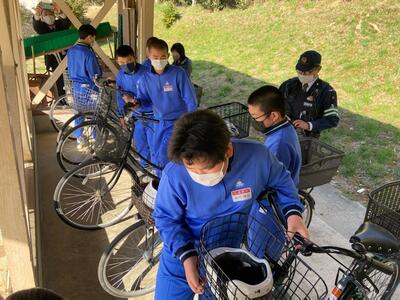 「交通講話」では、ビデオの映像を交えながら、自転車の特性や事故に遭わないようにするための正しい乗り方、安全点検のポイントについてお話しを聞きました。終了後は、実際に講師の方立ち合いのもと、自転車の安全点検を実施。全員合格をいただきました。
