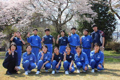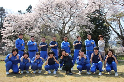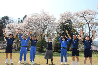 2022年4月12日 14時46分晴天に恵まれた今日、昼休みに桜の木の下で学年ごとに集合写真を撮影しました。
