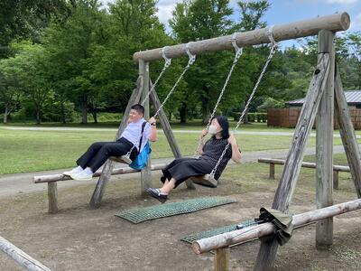 小岩井農場では、ガイドさんに園内の牛舎やサイロを案内していただいた後、BBQランチをいただきました。食後は、園内を散策したり、アーチェリーやアスレチックを楽しんだりと、思い思いに過ごしています。