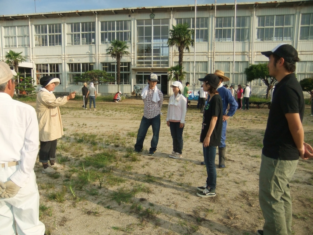 会長さんのお話しを聞いて、さあ やろう! 園 庭 の 草 刈