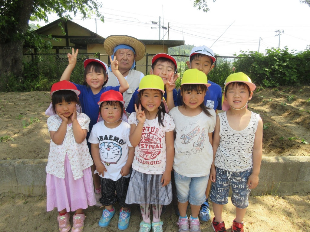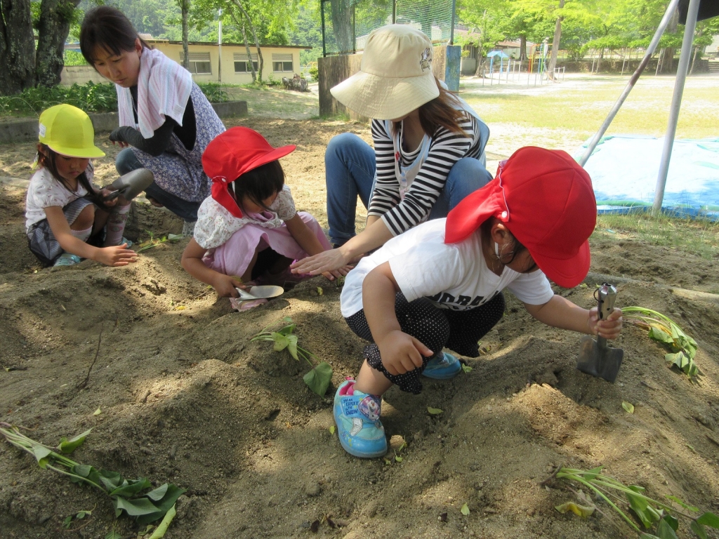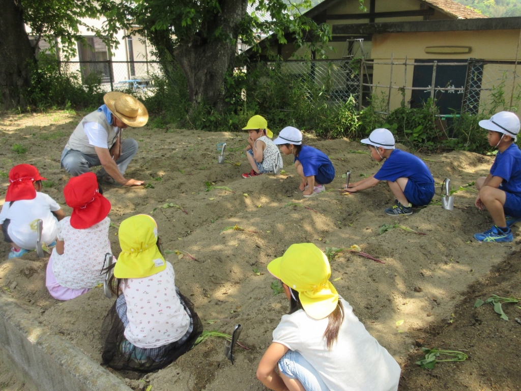 第四幼稚園では、大野二小の1年生と一緒にさつまいもの苗植えをしました(^^♪