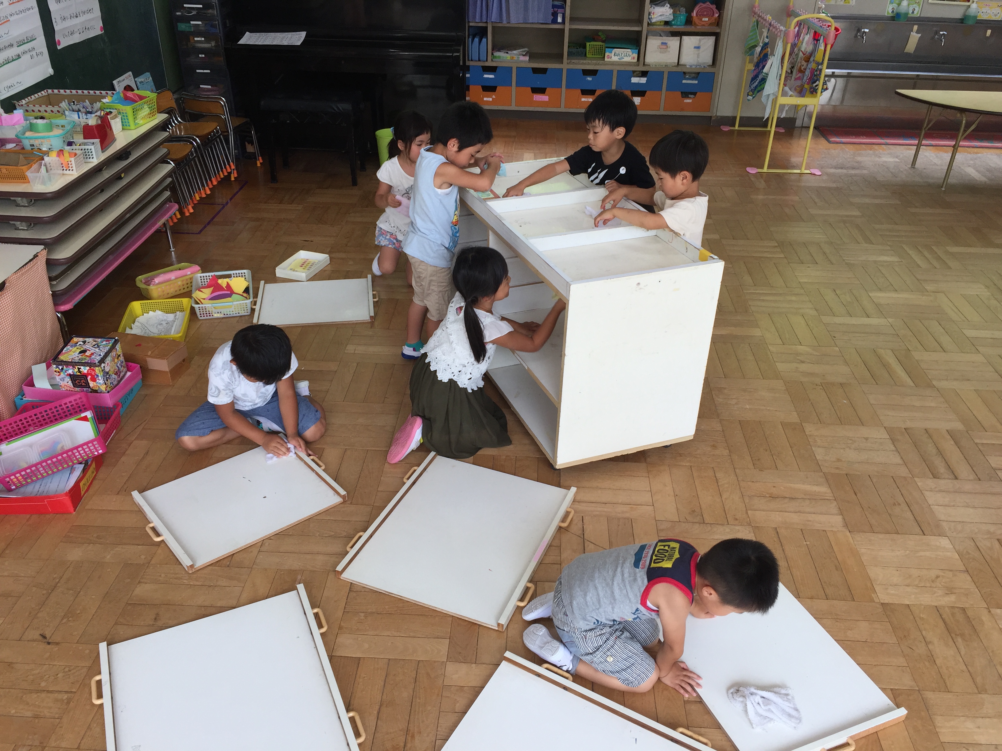 長い休みに入る前に、保育室のお掃除をしました