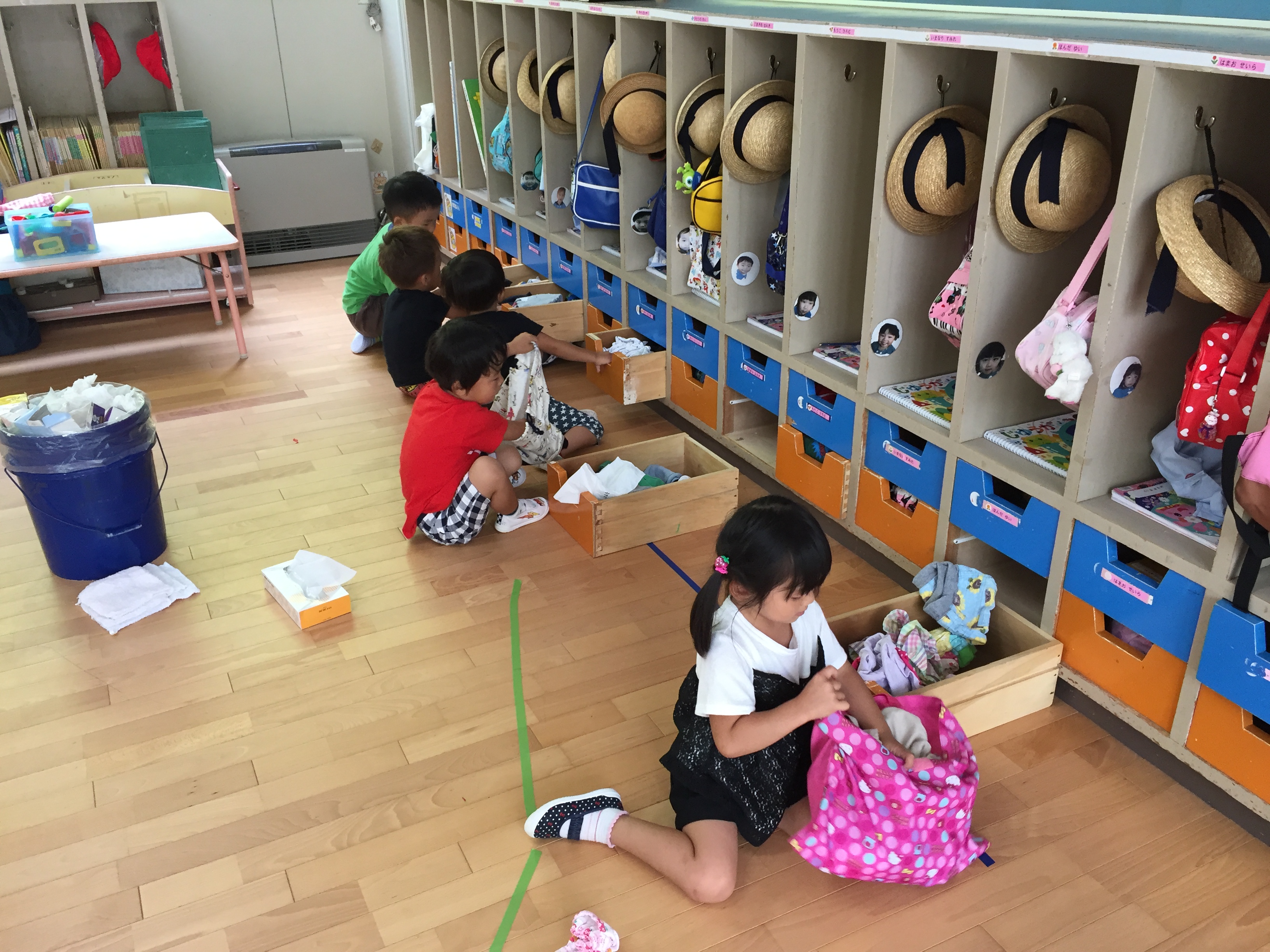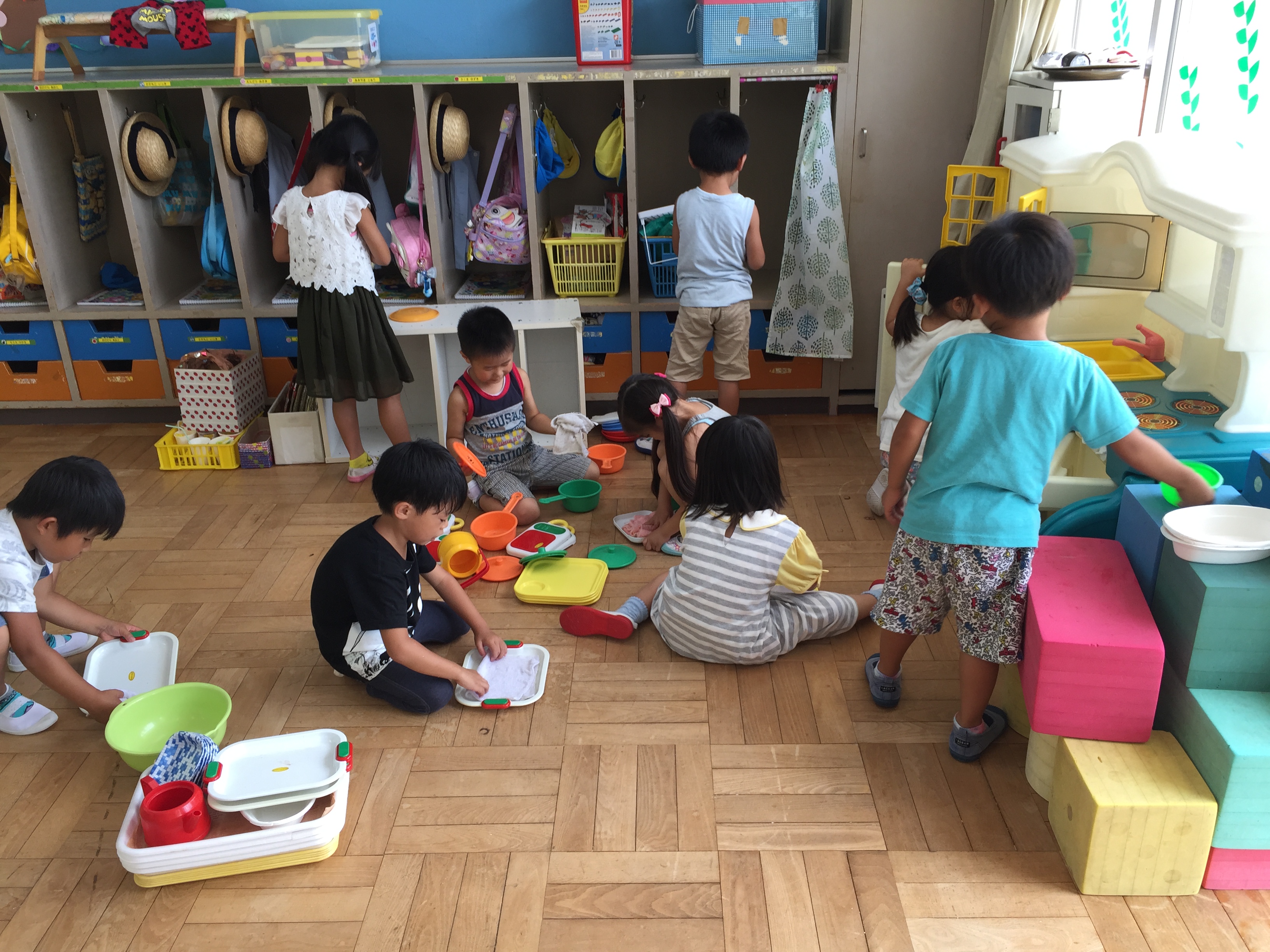 自分のロッカーや引き出しを掃除した後、クラスの玩具や砂場道具もきれいにしました