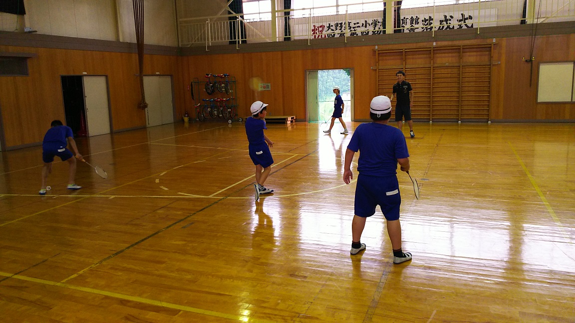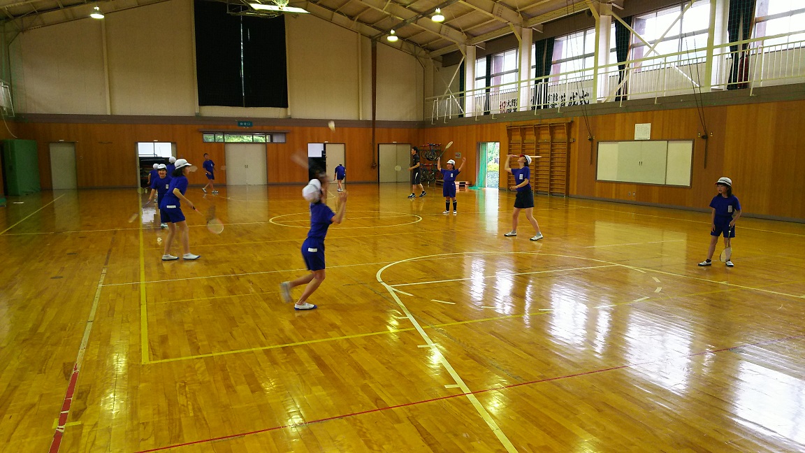 2018年5月28日 15時17分6校時、雷の鳴る中、体育館でクラブ活動が行われました。学校行事以外では4年生から6年生までそろって活動するのはクラブ活動くらいなので、特に4年生が楽しそうでした。そこに、校長と養護教諭が突然の乱入。児童に向かって、バドミントンの勝負を申し込み、そして‥‥。