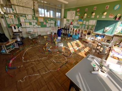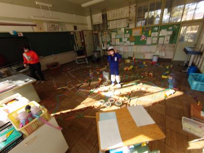 2021年1月22日 08時57分昨日、1・2年生が教室の中に迷路を作ったので見に来てほしいという依頼がありました。教室内にはいろいろなものが敷き詰められて迷路ができていました。教室内にあるものすべてを活用したようで、中には本物そっくりのイチゴのマグネットもあって驚きました。子供の発想はとても自由ですね。